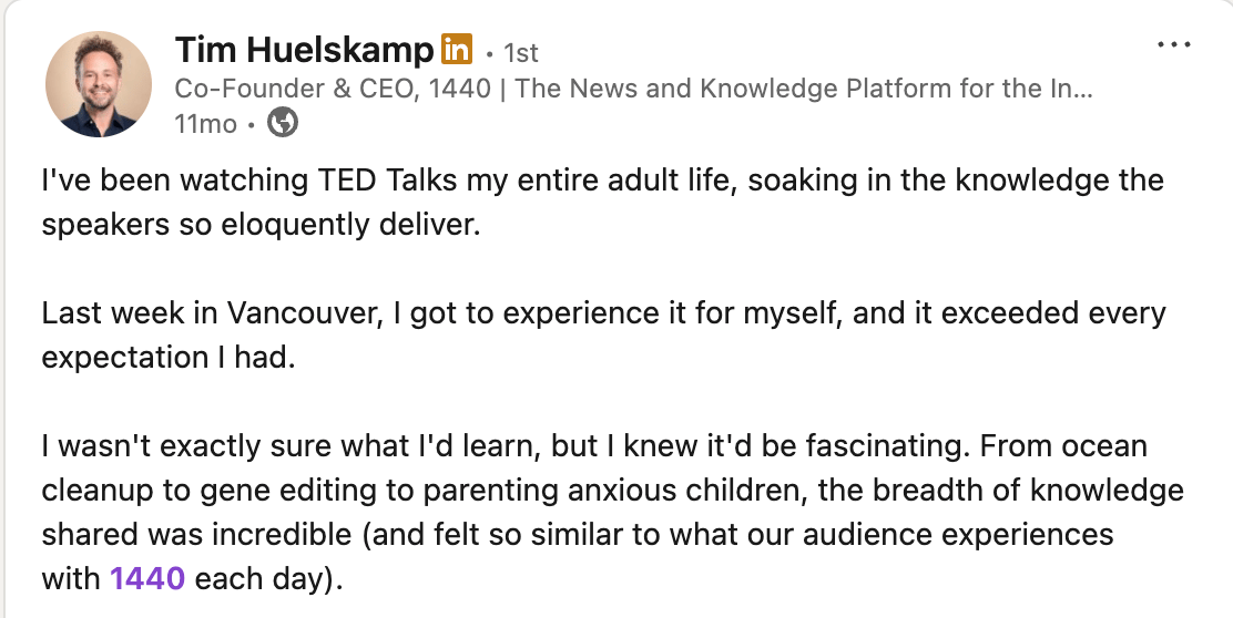 Tim’s appreciation for TED makes that path feel even more believable. After attending TED in Vancouver, he wrote that he’d been watching TED Talks his entire adult life and was struck by how similar the experience felt to what 1440’s audience gets every morning.